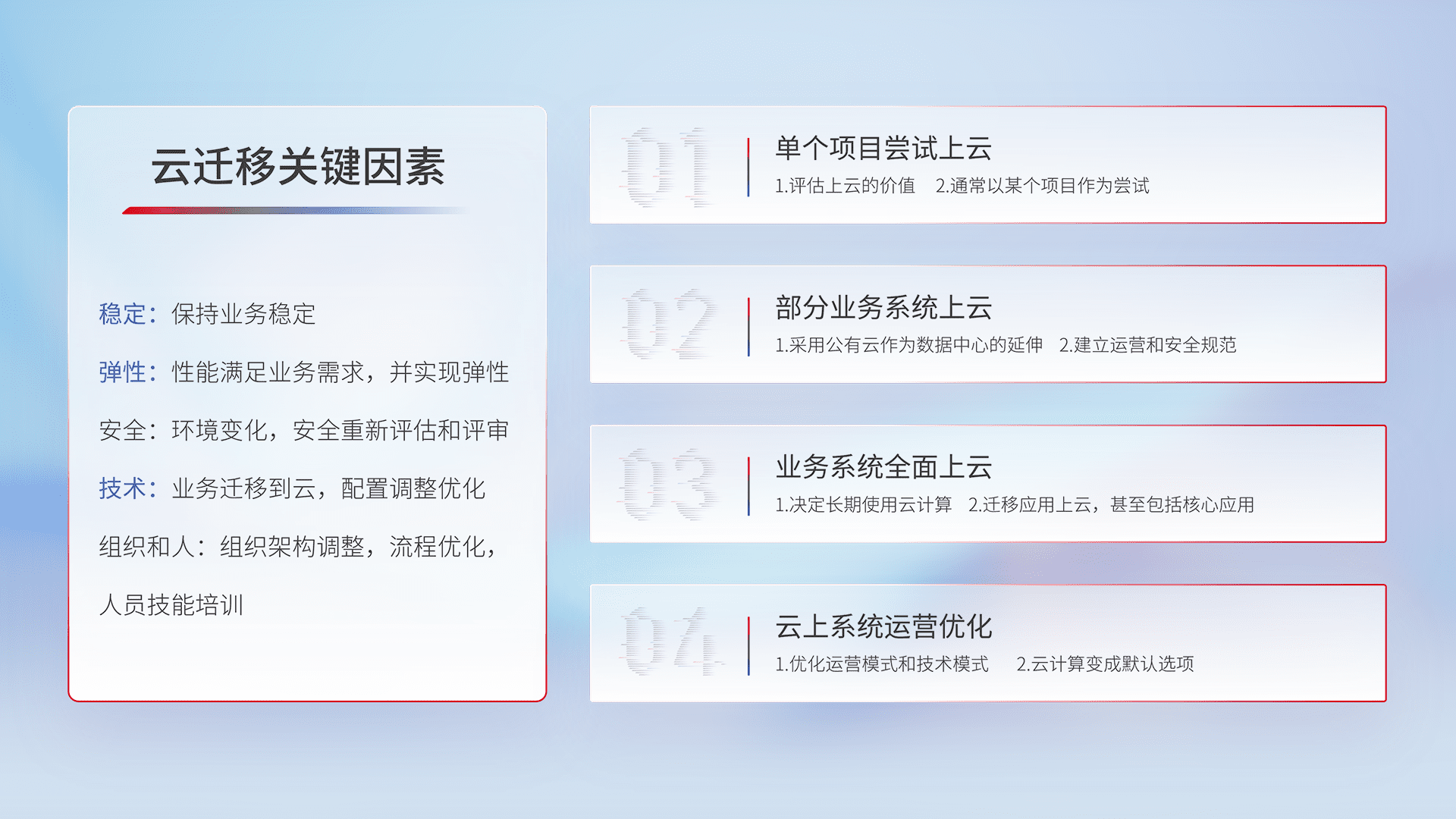 结合实际业务,,,从规划设计、、、、云平台选型、、、云原生改造、、、数据迁移、、集成交付,,,迁移全过程为客户识别最佳上云路径,,做好风险识别管理,,设计网络架构、、、、身份权限、、、安全审计合规、、、操作审计、、、日志审计、、监控告警策略、、、、多站点容灾设计等,,,对云上基础设施进行整体规划,,,,提升IT治理水平,,以满足弹性、、、高可用、、、高性能的需求。。。。